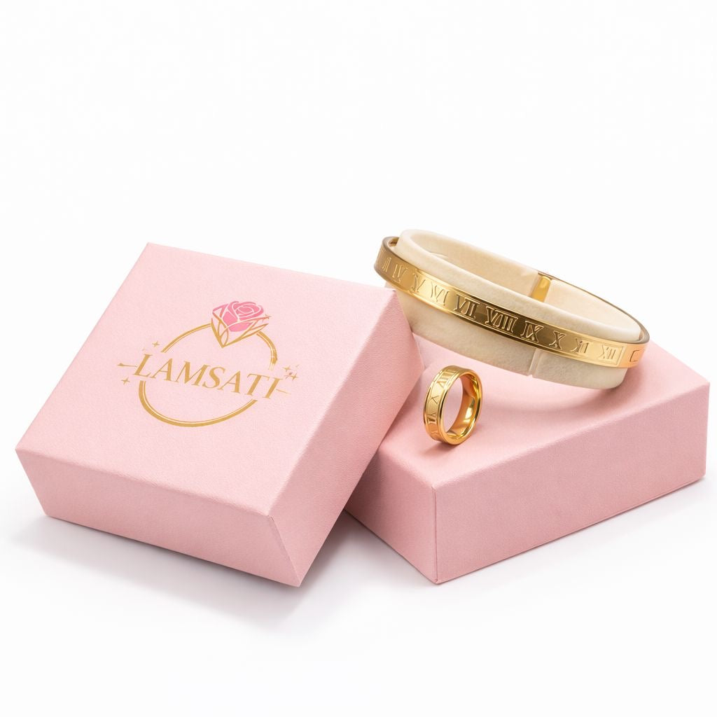 This matching bracelet and ring set features refined Roman numeral details, designed to represent time, meaning and connection. Minimal, feminine and luxurious — delivered in our signature Lamsati gift box.